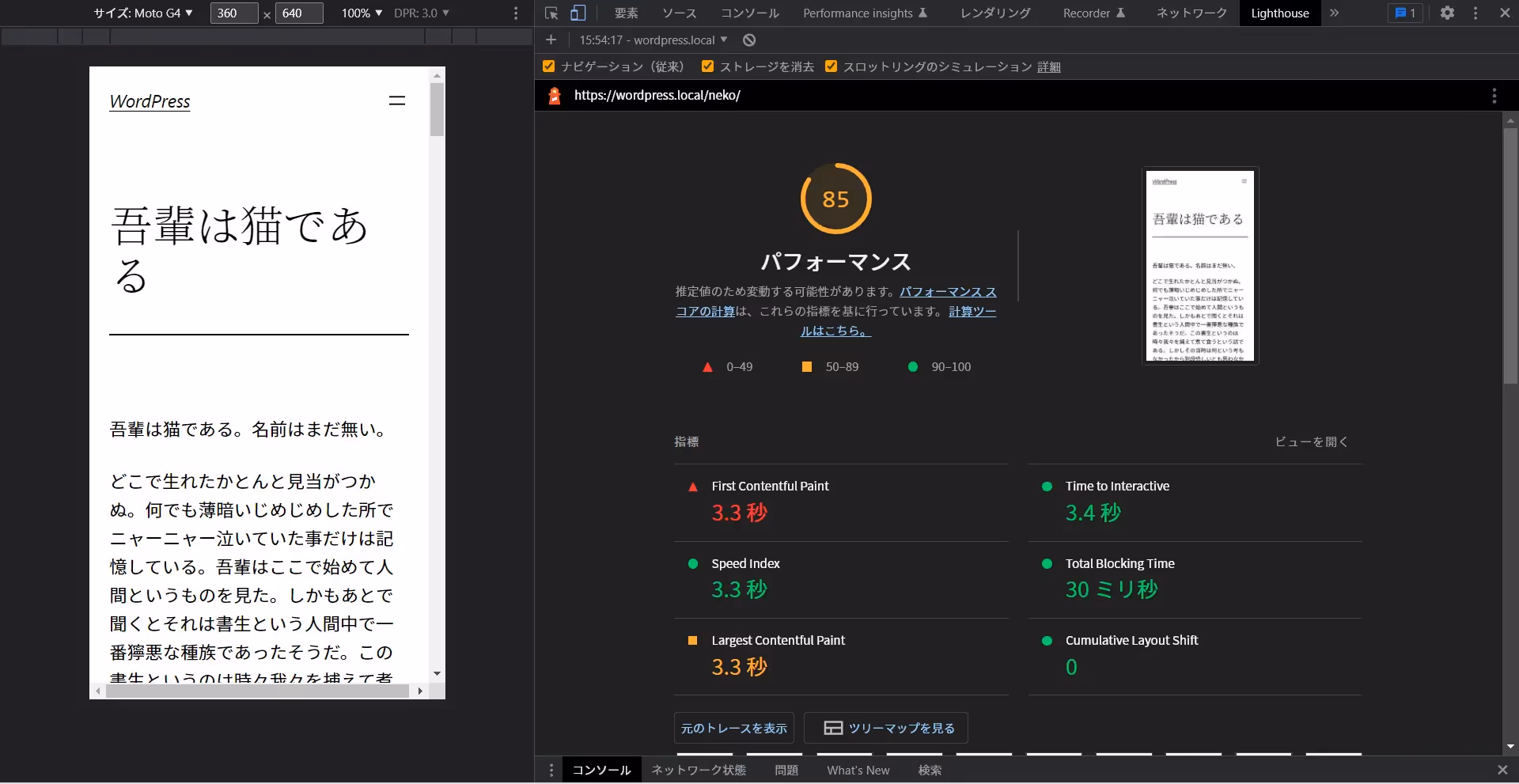 WordPress 公式テーマ Twenty Twenty-Two を使いカスタマイズの効果を検証します。計測は Lighthouse で行います。計測対象のデバイスはモバイルです。