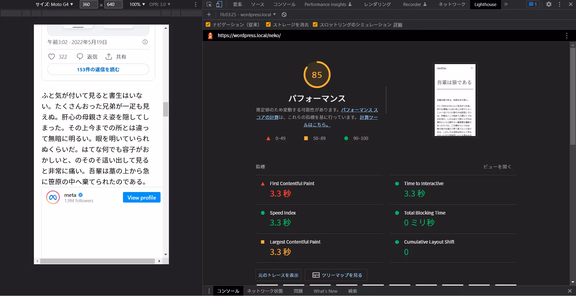 Twitter のツイートが 3 つ、Instagram の投稿が 3 つがある状態のまま今回のカスタマイズを行った計測結果です。スコアが 85 点に回復しました。文字だけしかない時とほぼ同じスコアが出ると思います。